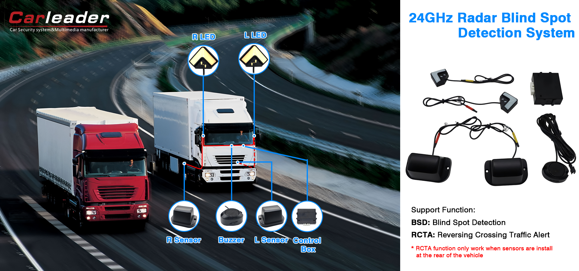 कार्लीडर के 24GHz रडार सेंसर ब्लाइंड एरिया डिटेक्शन सिस्टम 24GHz मिलीमीटर वेव रडार तकनीक और सुपरकंप्यूटिंग तकनीक का उपयोग करते हैं, जो उच्च गति वाली ड्राइविंग के दौरान डेटा पर सुपरकंप्यूटिंग करने के लिए, बाएं वाहन और रियर हाई-स्पीड के करीब जाने वाले वाहन की दूरी का सटीक पता लगाते हैं, और वास्तविक समय में वाहन का पता लगाते हैं। जब वाहन एक खतरनाक अंधे स्थान पर होता है, तो 24GHz मिलीमीटर रडार कार BSD ब्लाइंड स्पॉट डिटेक्शन सिस्टम एक बजर और एलईडी साउंड और लाइट अलार्म का उपयोग करता है ताकि दुर्घटनाओं से बचने के लिए आवश्यक उपाय करने के लिए ड्राइवर को तुरंत सूचित किया जा सके।