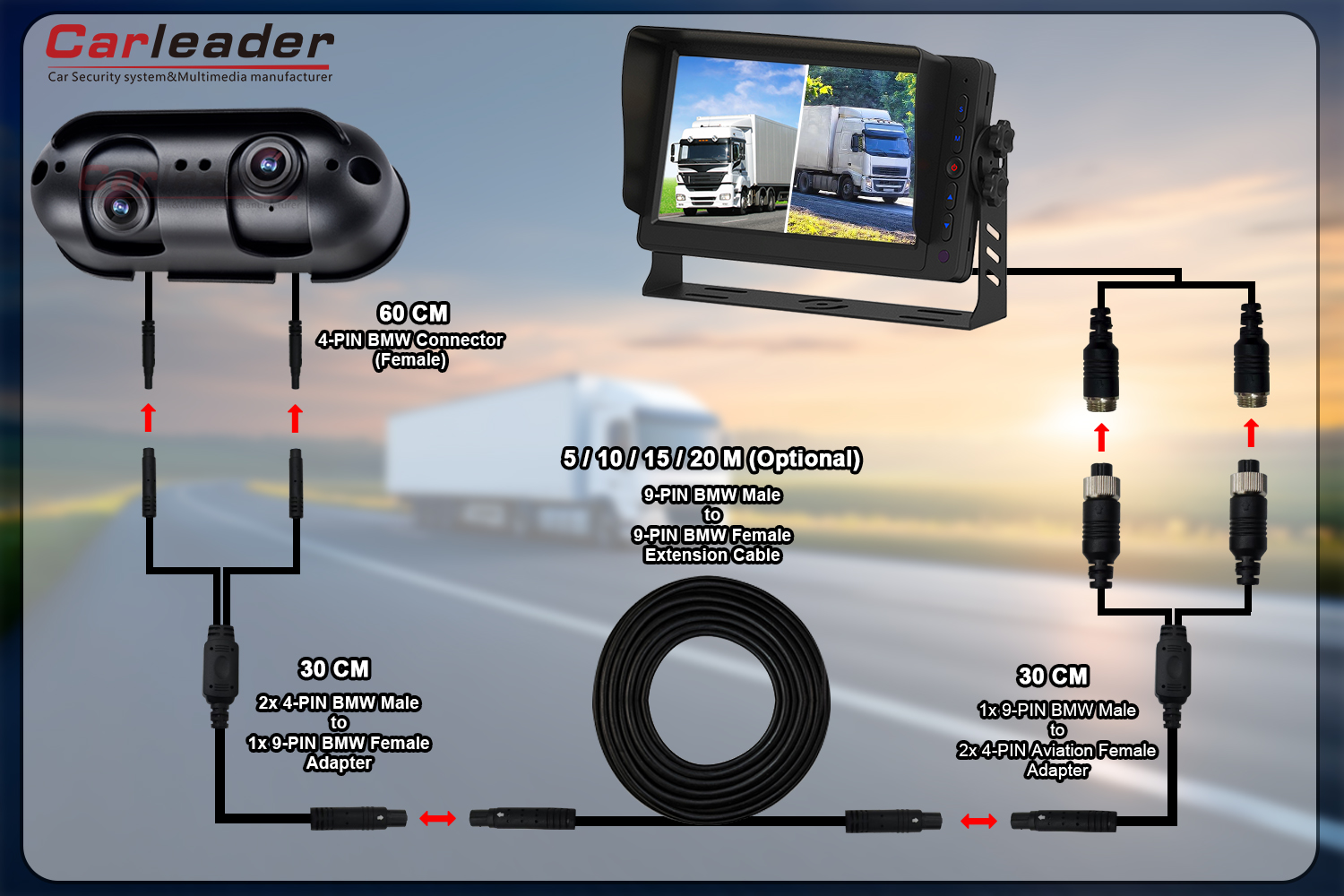 पहला समाधान कैमरा और मॉनिटर को कनेक्ट करने के लिए केवल एक एक्सटेंशन केबल (9-पिन बीएमडब्ल्यू कनेक्टर), दोनों सिरों के लिए 1 से 2 स्प्लिट केबल का उपयोग करता है। क्योंकि यह समाधान केवल हमें एक्सटेंशन केबल पर देता है, जो वायरिंग प्रक्रिया को आसान और अधिक सुविधाजनक बनाता है।